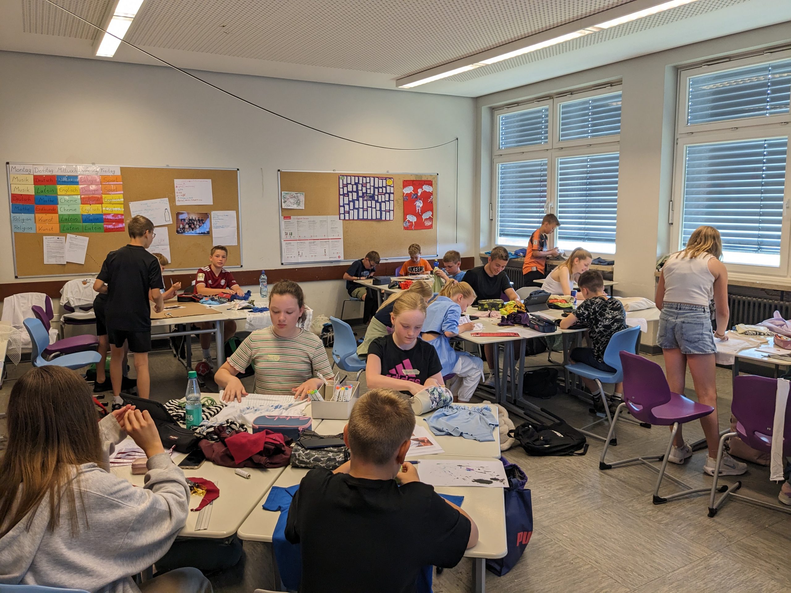 Im Projekt “T-Shirts neu erfinden“ von Frau Marks lernen die Schüler*innen, inwiefern Mode mit Nachhaltigkeit zu tun hat und wie man alte, nicht verwendete T-Shirts, Haarbänder und noch mehr nachhaltig wiederverwerten und neugestalten kann.