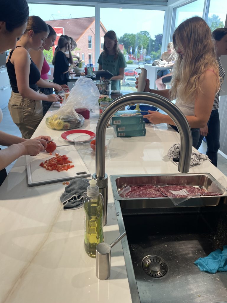 Bei Plaggenborg durfte die Gruppe eine Küche mit Sitzgelegenheiten nutzen, wo sie kochen und später das Essen genießen konnten. Es wurde vorher aufgeteilt, wer an welchem Gericht arbeitet, damit das Arbeiten sinnvoll aufgeteilt werden kann.