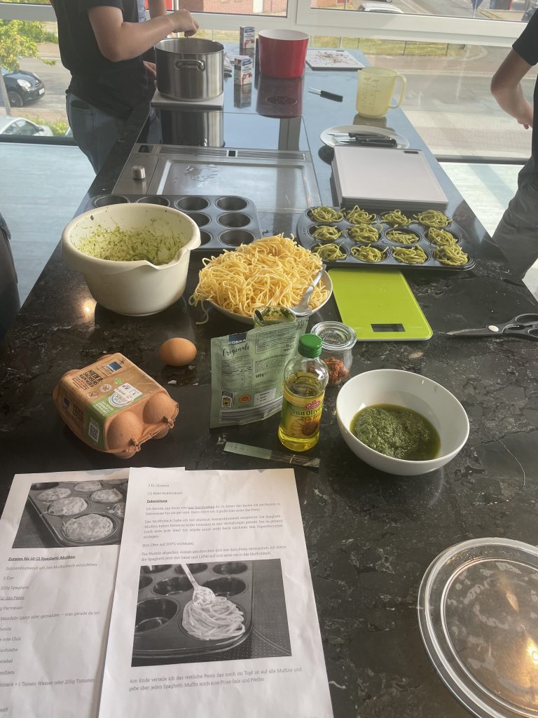 indem sie am Donnerstag einfach die Reste wiederverwendet haben, um daraus Spaghetti-Muffins zu kochen. Als Beilage sind zusätzlich noch Tacos vorbereitet worden. Die Tacos konnten individuell befüllt werden, sodass jeder etwas finden konnte. So wurden alle Wünsche erfüllt.